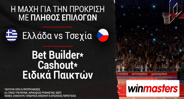 Η συνδυαστική επιλογή Ελλάδα χάντικαπ -5,5 στο ημίχρονο & Τσεχία under 38,5 πόντοι στο ημίχρονο & νίκη για την Ελλάδα 11-15 πόντους & σύνολο πόντων αγώνα under 170,5 σε απόδοση 12.00 στο Bet Builder της winmasters.